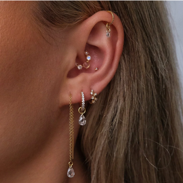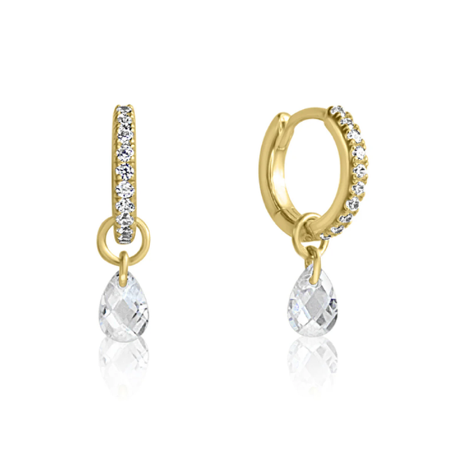 Discover your allure with our Teardrop Crystal Huggies. These minimal-chic earrings are adorned with a checkerboard-cut teardrop crystal which delicately hangs from a shimmering hoop, perfectly complimenting any outfit.